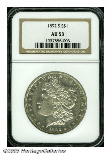 <B>1892-S<S$1> AU53 NGC.</B></I> Untoned with a fair amount of glassy reflectivity clinging to the devices. While plentiful in lower grades, Uncirculated 1892-S Dollars have earned the respect of collectors for decades. Solid AUs such as this are a very sensible, cost-saving alternative.<BR><I>From The Empire State Collection.</B></I>