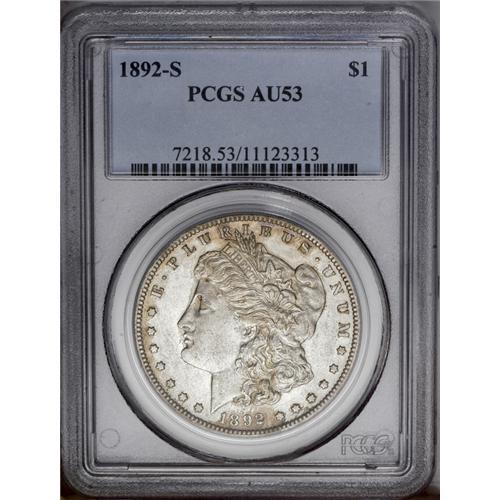 <B>1892-S<img border='0' src='http://www.heritagecoins.com/images/star.gif' width=10 height=10>$1> AU53 PCGS.</B></I> Blushes of golden-brown patina embrace portions of this predominantly pearl-gray key date dollar. Little wear is evident on the devices, but the reduced luster across the open fields and over the cheek confirms brief circulation.