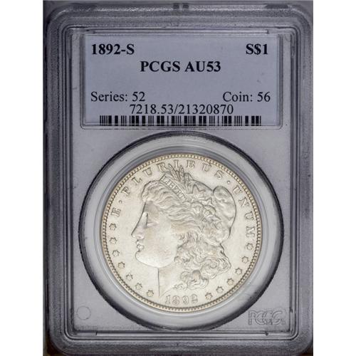 <B>1892-S<img border='0' src='http://www.heritagecoins.com/images/star.gif' width=10 height=10>$1> AU53 PCGS.</B></I> It seems like every auction we have multiple examples of this key issue consigned in various grades. This is an especially attractive and appealing coin at the AU53 level. And as a digression, we would like to point out that the AU53 grade is an interesting one and one that gives the buyer extra value. The difference in wear between an AU50 and an AU53 coin is almost indiscernible, but the AU53 coin will always have superior eye appeal because of noticeable luster remnants around the devices. And that is just how we would describe this coin: minimal wear with noticeable luster still in evidence. It is brilliant throughout with a few small abrasions on the back portion of Liberty's jawline, but otherwise a clean, problem-free example. <BR><BR><B>Important notice:</B> Heritage usually auctions material at the rate of 200-250 lots per hour. On some occasions eBay Live bid software or the Internet may not be able to keep up with the pace of the auction. We recommend placing a realistic absentee bid now as insurance to avoid disappointment. Occasionally the auctioneer may eliminate or reject an eBay Live bid, and the auctioneer may also reopen a lot after the close of the eBay live bidding (usually because we missed an audience bid), and may reject your bid even if it shows you as the winning bidder. By bidding via eBay Live, you agree that Heritage may award the lot to another bidder at its sole discretion under the circumstances described above or any other reasonable circumstances. Since eBay bids are not shown to us until we open the lot on the floor, we treat those bids just like floor bids. In most cases the floor responds before the eBay bid is presented to us, due to Internet lag time, so for consistency we have made it a policy that floor bids are always considered first over tie eBay live bids. Also please note that all Heritage lots purchased through eBay Live carry a 20% Buyer's Premium. Please make sure you read the Terms and Conditions before you bid. This lot is being auctioned in conjunction with a live floor auction by Heritage Galleries & Auctioneers. All final auction and invoice information will be supplied by Heritage Galleries & Auctioneers, and all other information should be considered preliminary. Lot:3607 <BR><BR><B>Winning Notification and Billing:</B> After the FINAL session in this auction is complete, Heritage will send e-mail and snail mail invoices. This process normally takes several days. All final auction and invoice information will be supplied by Heritage Galleries & Auctioneers, and all other information should be considered preliminary. <BR><BR>This auction will be conducted on a live auction floor and over the Internet through eBay Live. If you choose to place an absentee bid, please take a moment to <font color='#0000ff'><u><a href='http://pages.ebay.com/liveauctions/help/before/laabsentee.html'>learn how eBay Live absentee bidding works</a></u></font><font color='#000000'>