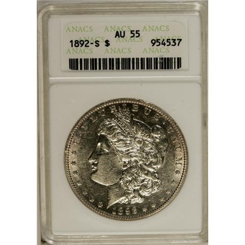 <B>1892-S S$1 AU55 ANACS.</B></I> This better date dollar has a prooflike reverse, and the obverse displays ample peripheral cartwheel luster. Light plum toning denies full brilliance. An absence of unpleasant marks confirms the quality of this charming slider.<BR><BR><b>Shipping:</b> Coin/Currency (<a target="_blank" href="http://www.heritageauctions.com/common/shipping.php">view shipping information</a>)