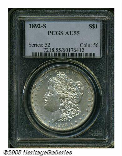 <B>1892-S<S$1> AU55 PCGS.</B></I> An essentially untoned, moderately abraded, and richly detailed representative of this elusive issue. One of the most difficult dates in the series to obtain in AU and higher grades. In fact, this example appears to fit nicely in an Uncirculated set.<BR><I>From The Dr. John L. Pellegrini Collection.</B></I>