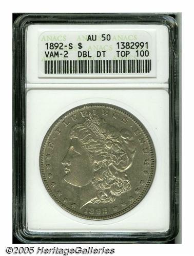 <B>1892-S<S$1> Doubled Date AU50 ANACS.</B></I> VAM-2. Top 100 Variety. The date is repunched, most notably within the loops of the 8. The 1892-S is conditionally rare. This example displays silver-gray color and considerable residual luster in the protected areas. The hair over Liberty's ear is weak, and just a few miniscule marks are scattered about, none of which are distracting.