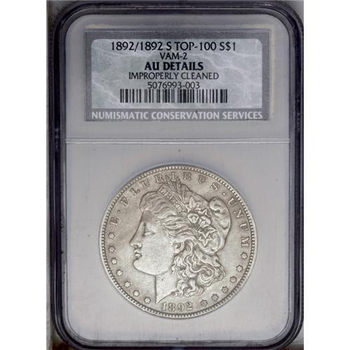 <B>1892-S<img border='0' src='http://www.heritagecoins.com/images/star.gif' width=10 height=10>$1> Doubled Date--Improperly Cleaned--NCS. AU Details.</B></I> VAM-2. A Top 100 Variety. NGC has yet to certify a Mint State example of this elusive VAM. A cloudy and subdued slate-gray piece with light wear on the central highpoints.