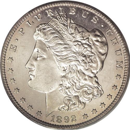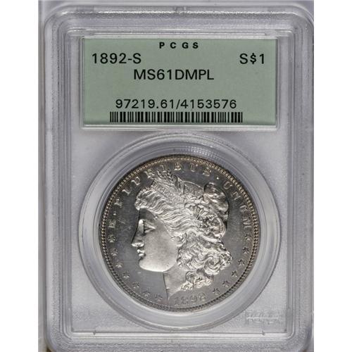 <B>1892-S<img border='0' src='http://www.heritagecoins.com/images/star.gif' width=10 height=10>$1> MS61 Deep Mirror Prooflike PCGS.</B></I> This is the only 1892-S Morgan dollar graded by either NGC or PCGS which shows the desirable Deep Mirror Prooflike surfaces. As we know, the 1892-S is one of the key dates to the series, very similar to the 1893-S with virtually the entire mintage melted. Most other dates of Morgan dollars were found in mint-sealed bags in the Treasury vaults in the 1960s and released to the public. No additional coins were found of the 1892-S and 1893-S, and these dates were suddenly elevated to the top tier of rarities for this series. Despite the moderate grade, this is a very attractive coin. The fields show the expected deep mirroring imparted by the dies, and the all-important surfaces show just a few trivial ticks from handling. This particular coin is identifiable by a minor two-pronged reeding mark on the jawline of Liberty, and some tiny, microscopic nicks seen in the field before her eye. The reverse is excellent as well. We note a tiny double scrape just past the R of DOLLAR, and a small nick above the eagle's beak. Peripheral toning is found on the reverse, of medium golden-tan color; lighter lilac toning on the obverse is seen in the fields and also near the borders. The strike is reasonably sharp over Liberty's ear, and the breast of the eagle shows decent definition. A few wispy lines are found in the fields, and these must have accounted for the moderate grade. It should be noted that this example is housed in a PCGS holder with a light-green label, and was apparently thus encapsulated sometime prior to September of 1992. An important and perhaps conservatively graded key date example, and one that is certain to draw considerable attention from serious bidders. Population: 1 in 61 Deep Mirror Prooflike, 0 finer (6/06).<BR><I>From The New York Eye Appeal Collection.</B></I>