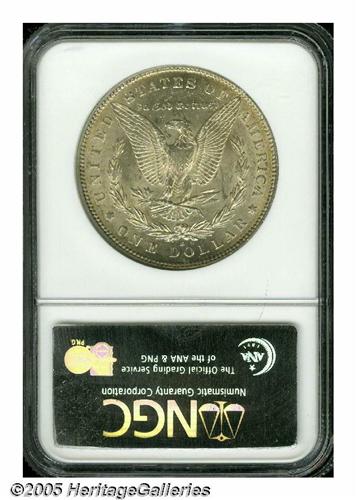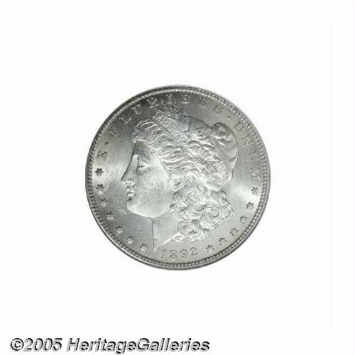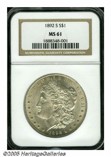 <B>1892-S<S$1> MS61 NGC.</B></I> The 1892-S is the second scarcest issue in the entire Morgan series, next only to the 1893-S. While relatively available in XF and AU condition, Uncirculated examples of the 1892-S are extremely rare and seldom offered at public auction or in dealer's showcases. This is an attractive example that is essentially untoned with a few small blemishes overall and some notable scuffiness on the obverse. Some weakness of strike is also noted on the central highpoints of each side, these being the essential grade-limiting factors. The luster is a bit thin, but it does cover all the surfaces from fields to devices.