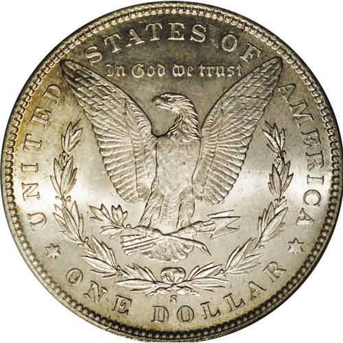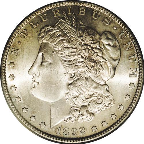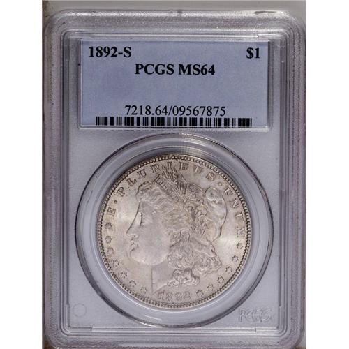 <B>1892-S<img border='0' src='http://www.heritagecoins.com/images/star.gif' width=10 height=10>$1> MS64 PCGS.</B></I> The 1892-S was produced to the tune of 1,200,000 business strikes. Based on the fact that most of the known population consists of examples in various states of wear, we must assume that many if not most of these were apparently placed into circulation within a decade or two after striking. Of the nearly 3,300 specimens certified by PCGS and NGC combined, fully 3,200 are in circulated grades! The vast majority of these are in the XF to AU grade ranges, and are readily available today.<BR> It is interesting to note that the '92-S was not recognized as a rarity in Mint State until after the San Francisco Mint dispersals from storage in the 1940s and 1950s yielded no bags of this date. It was also absent from the millions of Morgan dollars paid out by the Treasury during the 1962-1964 releases from government vaults. David Bowers, in his <I>Silver Dollars and Trade Dollars of the United States,</B></I> gives population estimates of the 1892-S Morgan in Uncirculated grades: MS60 to MS62, 75 to 150 coins exist; MS63, 25 to 50 pieces; near-Gem, 10 to 20 examples; and MS65 or better, 25 to 50 specimens. The PCGS/NGC data indicate somewhat fewer extant Mint State examples: nearly 50 coins grading MS60 to MS62, about 15 pieces each in MS63 and MS64, and nearly 20 in full Gem and finer.<BR> The near-Gem specimen presented in the current lot displays pleasing luster and whispers of tan-gold patina imbued with occasional accents of subtle sky-blue. The design elements are well impressed, and include nearly full definition in the hair over Liberty's ear and on the eagle's breast feathers. A few grade-defining marks on Liberty's face and neck are well within the parameters of the MS64 grade designation. An overall attractive coin that is found only infrequently in this level of preservation.