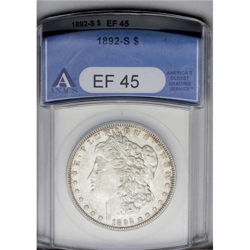 <B>1892-S<img border='0' src='http://www.heritagecoins.com/images/star.gif' width=10 height=10>$1> XF45 ANACS.</B></I> Mildly abraded and typically worn for the grade, the light-gray surfaces display pleasing russet, gold, and green patina near the borders. Remnants of the original mint luster still appear on both sides of this semi-key date Morgan dollar. <BR><BR><B>Important notice:</B> Heritage usually auctions material at the rate of 200-250 lots per hour. On some occasions eBay Live bid software or the Internet may not be able to keep up with the pace of the auction. We recommend placing a realistic absentee bid now as insurance to avoid disappointment. Occasionally the auctioneer may eliminate or reject an eBay Live bid, and the auctioneer may also reopen a lot after the close of the eBay live bidding (usually because we missed an audience bid), and may reject your bid even if it shows you as the winning bidder. By bidding via eBay Live, you agree that Heritage may award the lot to another bidder at its sole discretion under the circumstances described above or any other reasonable circumstances. Since eBay bids are not shown to us until we open the lot on the floor, we treat those bids just like floor bids. In most cases the floor responds before the eBay bid is presented to us, due to Internet lag time, so for consistency we have made it a policy that floor bids are always considered first over tie eBay live bids. Also please note that all Heritage lots purchased through eBay Live carry a 20% Buyer's Premium. Please make sure you read the Terms and Conditions before you bid. This lot is being auctioned in conjunction with a live floor auction by Heritage Galleries & Auctioneers. All final auction and invoice information will be supplied by Heritage Galleries & Auctioneers, and all other information should be considered preliminary. Lot:3604 <BR><BR><B>Winning Notification and Billing:</B> After the FINAL session in this auction is complete, Heritage will send e-mail and snail mail invoices. This process normally takes several days. All final auction and invoice information will be supplied by Heritage Galleries & Auctioneers, and all other information should be considered preliminary. <BR><BR>This auction will be conducted on a live auction floor and over the Internet through eBay Live. If you choose to place an absentee bid, please take a moment to <font color='#0000ff'><u><a href='http://pages.ebay.com/liveauctions/help/before/laabsentee.html'>learn how eBay Live absentee bidding works</a></u></font><font color='#000000'>