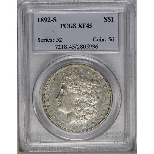 <B>1892-S<img border='0' src='http://www.heritagecoins.com/images/star.gif' width=10 height=10>$1> XF45 PCGS.</B></I> Evenly worn with the handling marks one would expect from circulation. The gray-gold surfaces still show traces of prooflike reflectivity.