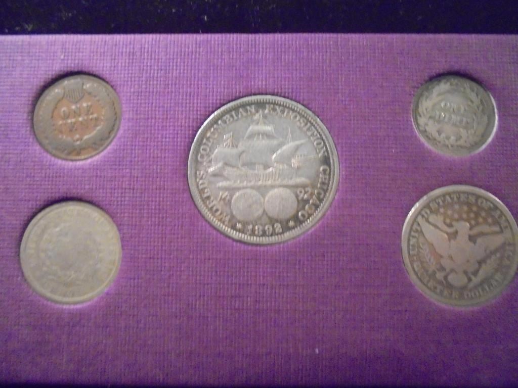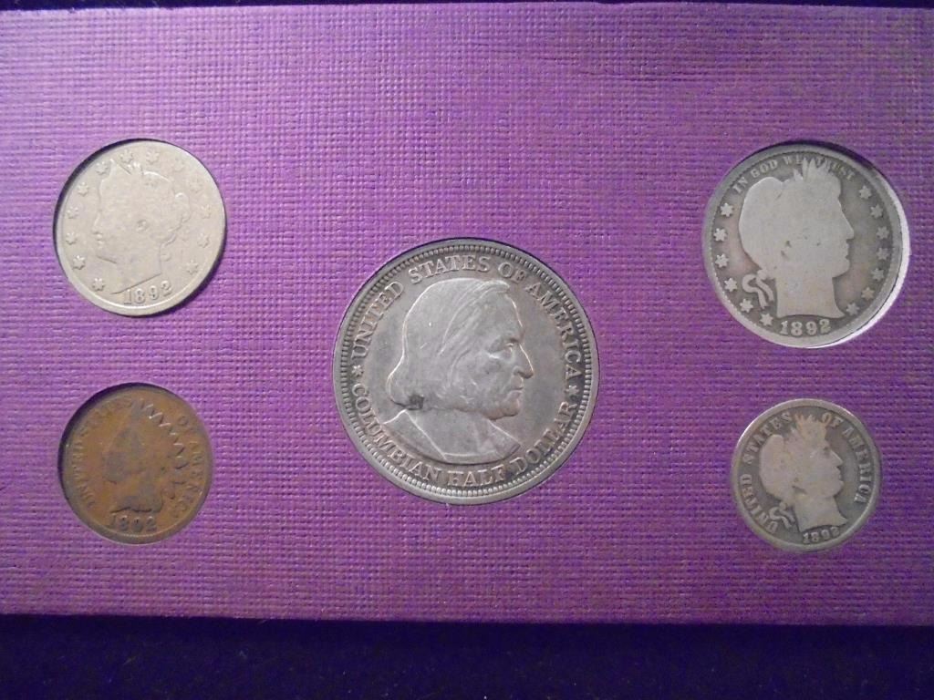 INDIAN HEAD CENT, LIBERTY "V" NICKEL, BARBER DIME, BARBER QUARTER AND COLUMBIAN EXPOSITION HALF DOLLAR.
