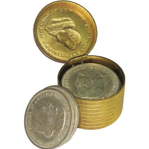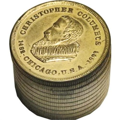 <B>1892 Simulated Stack of 10 Gold Coins (Case) With Coins.</B></I> Silver/brass, 35 mm x 26 mm. Hinged lid, gold-plated simulated gold stack of coins with a rendition of Columbus on the lid. Included inside are 10 1893 commemorative Columbian half dollars in varying conditions.<BR><BR><b>Shipping:</b> Coins & Currency (<a target="_blank" href="http://www.heritageauctions.com/common/shipping.php">view shipping information</a>)
