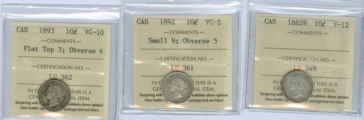 1892 Sm.9 Obv.5 VG8, 1893 Flat top Obv.6 VG10 Lot of 3 ICCS graded 10¢ coins, 1882H F12,