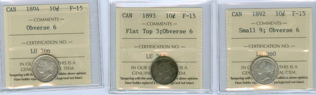 1892 Sm.9 Obv.6, 1893 Flat top Obv.6, 1894 Obv.6 Lot of 3 ICCS graded 10¢ coins, all F15.