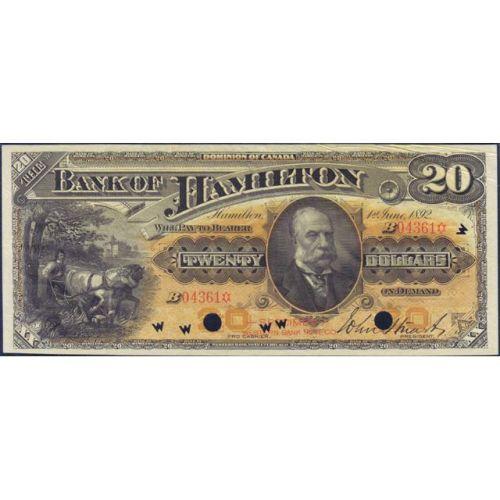 1892 Twenty Dollars Bank of Hamilton Specimen, CH-345-16-06S Serial Number 04361 B, PMG Extremely Fine 40 Exceptional Paper Quality. Plus the Vignette of John Stuart that is on the note, pencil dated Sept-1892