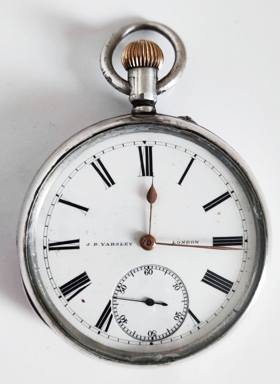 Vintage J.B. Yabsley pocket watch in solid silver with London hallmark. The case is 52mm in size. In working order.