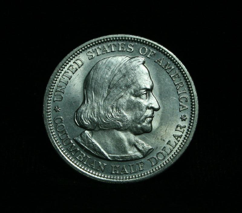 A very attractive example with good luster on this first US Commemorative. The Columbus Half dollar along with the Isabella Quarter were minted in honor of the 400th anniversary of Columbus' voyage to the new world. It was first distributed at the worlds fair honoring that voyage. When examining a Columbian Exposition half dollar The first points to show wear are Columbus’ eyebrow, cheek and the hair behind his forehead and jaw. On the reverse, check the foresail and mainsail, as well as the right side of the Eastern Hemisphere. Coin World's Coin Values lists ms63 at $90. Wholesale Greysheet Value in ms63 is $63. Estimated Value $70