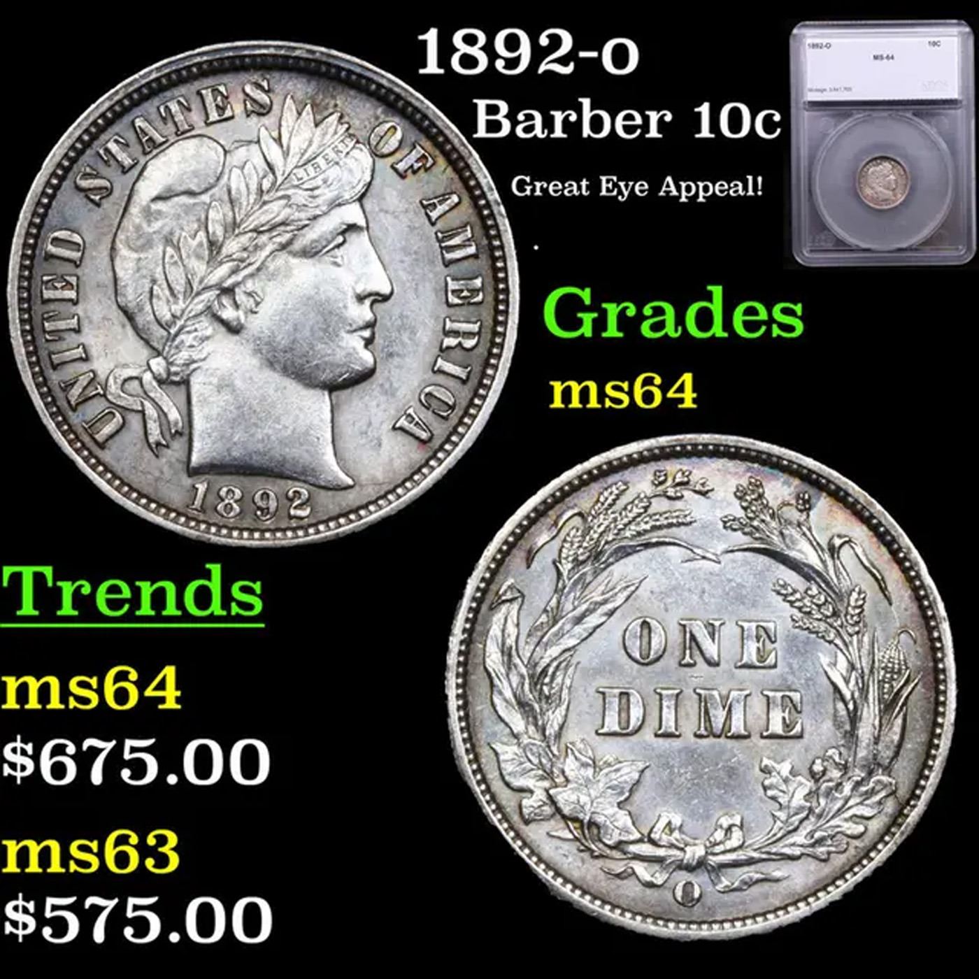 1892-o Barber Dime 10c Graded ms64 By SEGS.