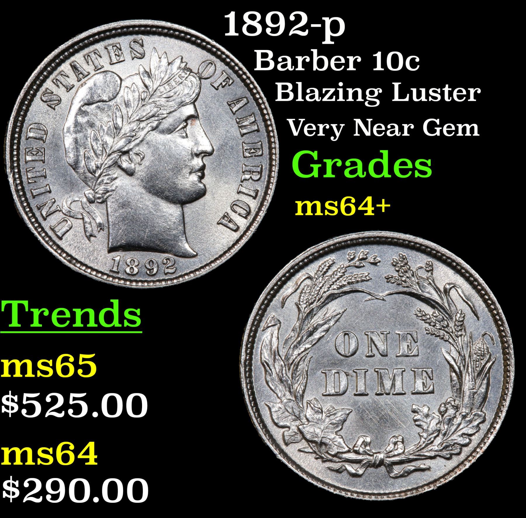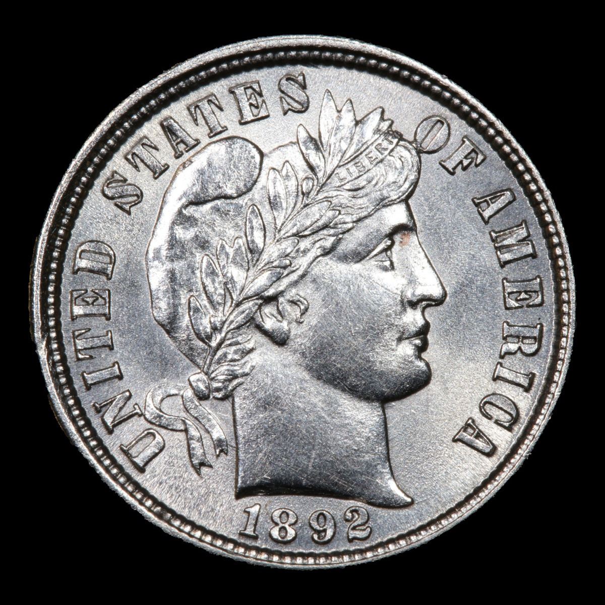 1892-p Blazing Luster Very Near Gem Barber Dime 10c Grades Choice+ Unc. First year of issue.