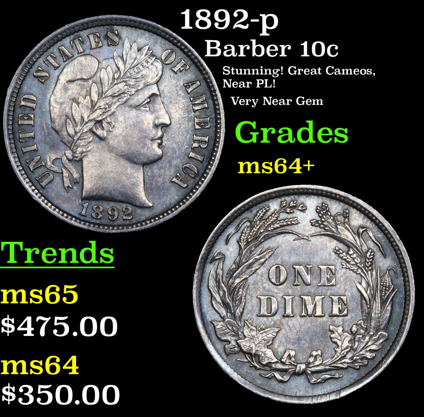1892-p Barber Dime 10c Grades Choice+ Unc. First year of issue.