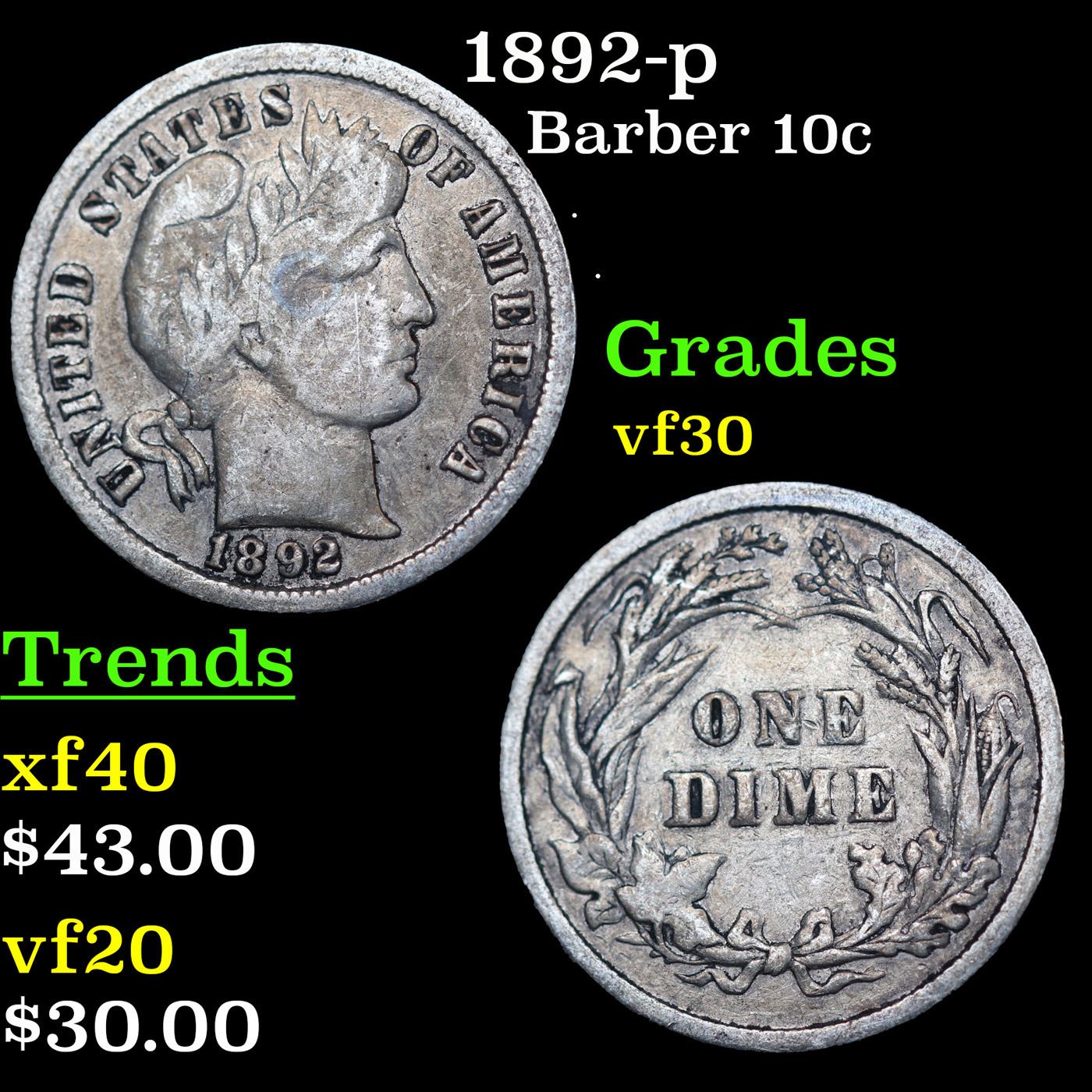 1892-p Barber Dime 10c Grades vf++. First year of issue.