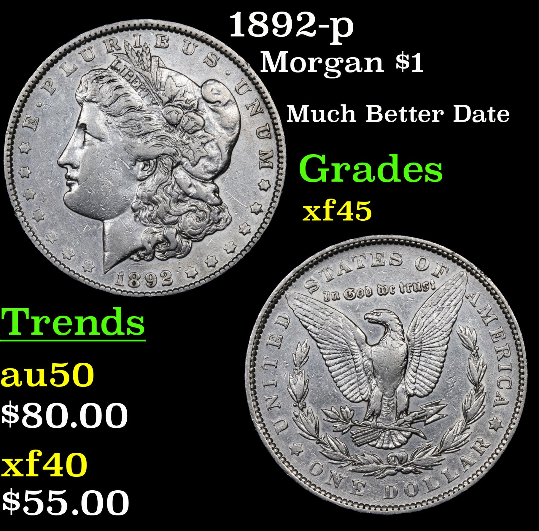 1892-p Morgan Dollar $1 Grades xf+.