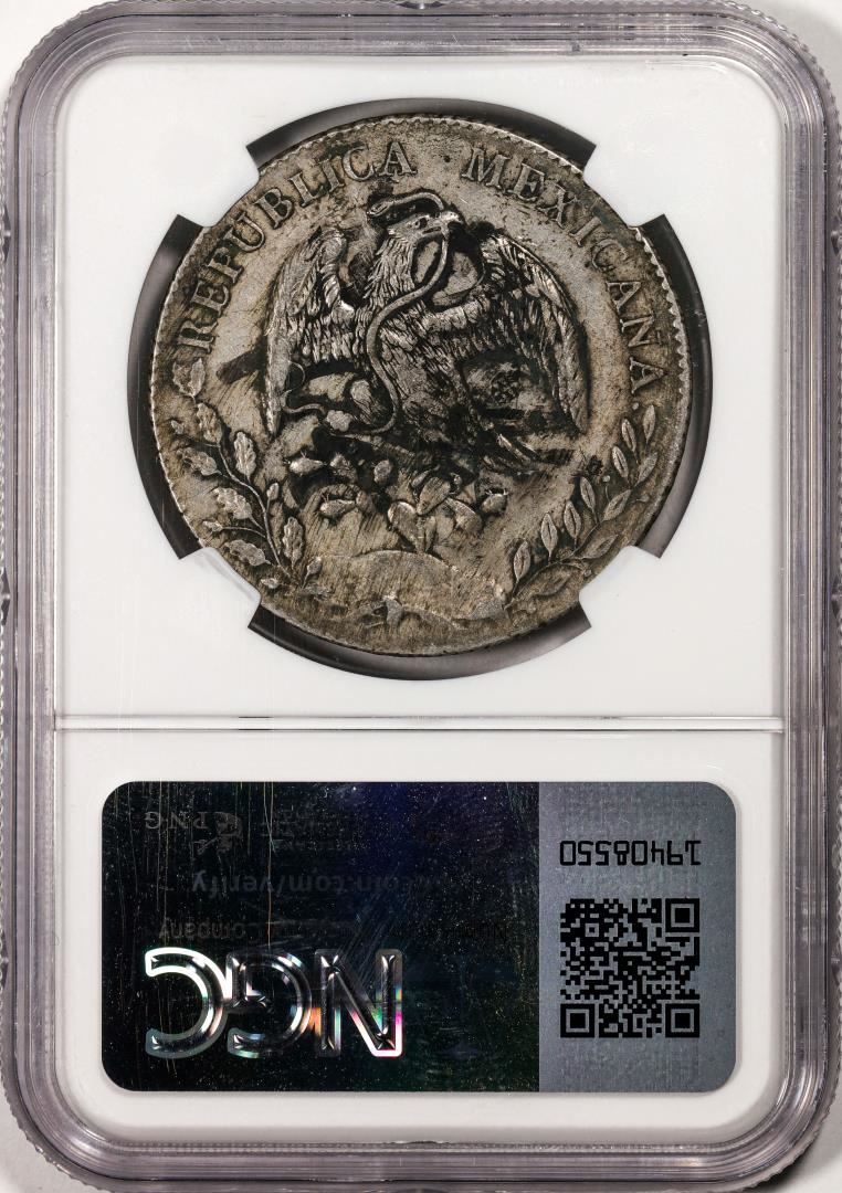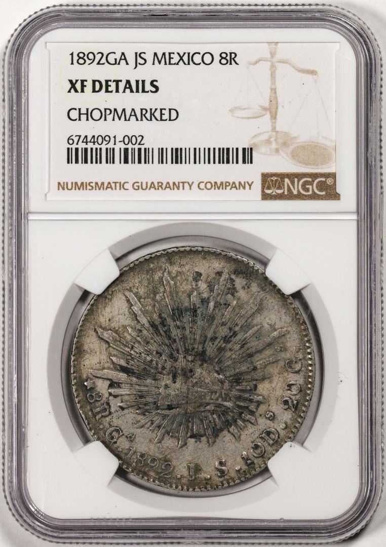 One 1892GA JS Mexico 8 Reales Silver Coin NGC XF Details Chopmarked. NGC Certified.