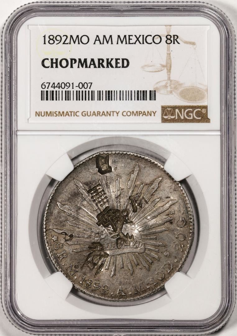 One 1892MO AM Mexico 8 Reales Silver Coin NGC Chopmarked. NGC Certified.