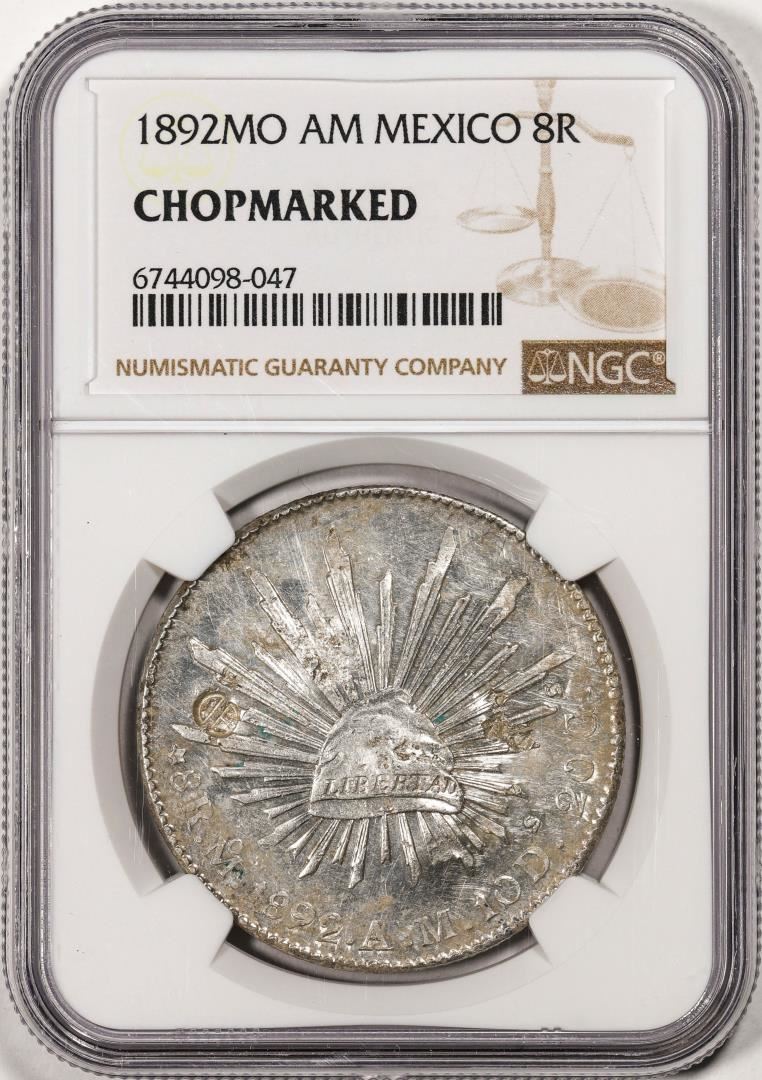One 1892MO AM Mexico 8 Reales Silver Coin NGC Chopmarked. NGC Certified.