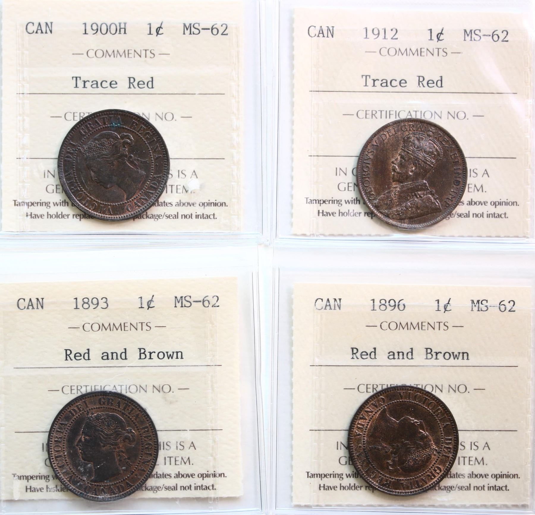 1893 1¢, 1896, 1900H, 1912. Lot of 4 coins ICCS Choice Mint State-62