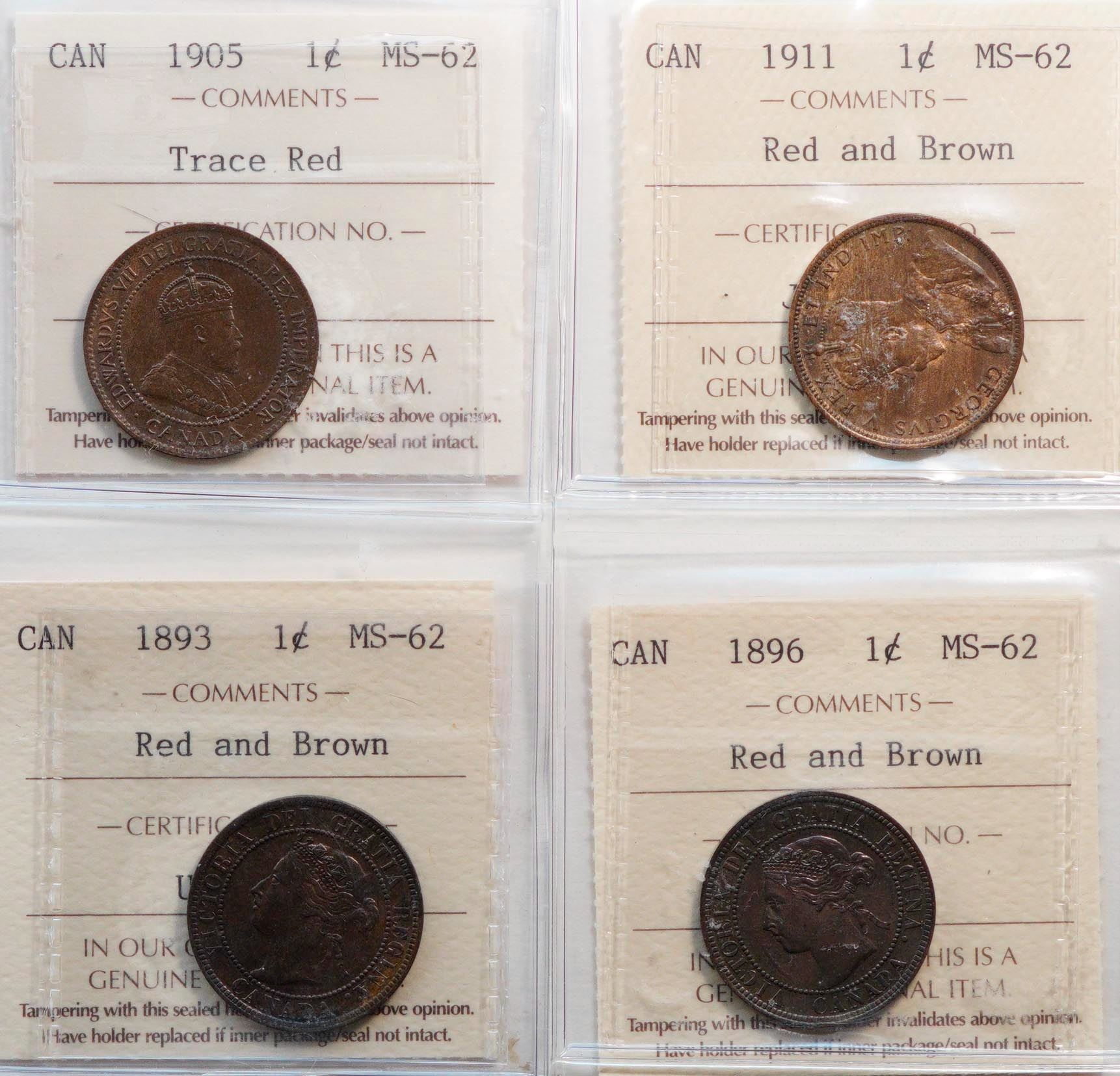 1893 1¢, 1896, 1905, 1911. All 4 coins ICCS Choice Mint State-62