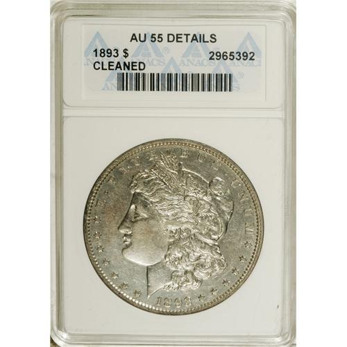 <B>1893 $1 --Cleaned--ANACS. AU55 Details.</B></I> NGC Census: (138/1740). PCGS Population (142/3133). Mintage: 389,792. Numismedia Wsl. Price for NGC/PCGS coin in AU55: $300. (#7220)<BR><BR><b>Shipping:</b> Coins & Currency (<a target="_blank" href="http://www.heritageauctions.com/common/shipping.php">view shipping information</a>)