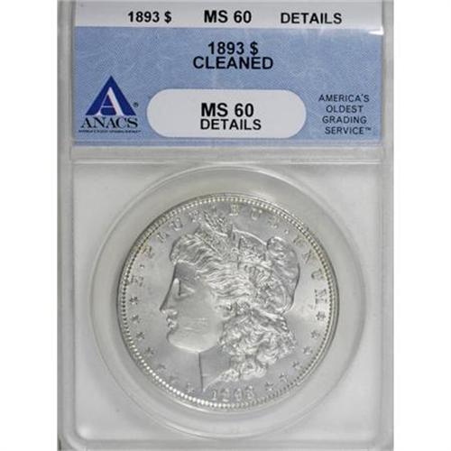 <B>1893 $1 --Cleaned--ANACS. MS60 Details.</B></I> NGC Census: (26/1636). PCGS Population (47/3074). Mintage: 389,792. Numismedia Wsl. Price for NGC/PCGS coin in MS60: $580. (#7220)<BR><BR><B>Coin Engraver:</B> George T. Morgan<BR><BR><b>Shipping:</b> Coins & Currency (<a target="_blank" href="http://www.heritageauctions.com/common/shipping.php">view shipping information</a>)