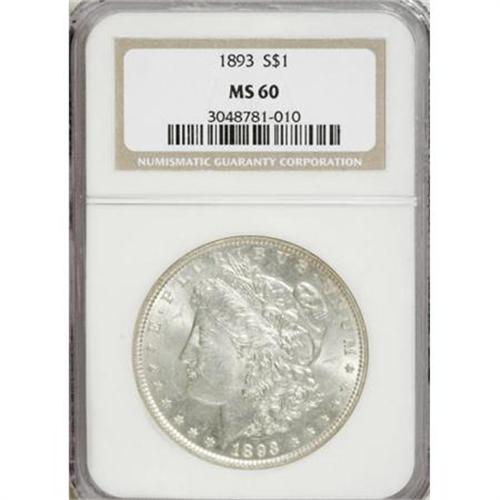 <B>1893 $1 MS60 NGC.</B></I> A boldly struck example that is much nicer than the grade would suggest. Typically, the MS60 grade is reserved for Mint State coins with issues, and while the luster is a bit reserved and the left portion of the obverse shows hairlines that are camouflaged by light tan toning, this is certainly not the unattractive coin that one expects in an MS60. <BR><BR><B>Coin Engraver:</B> George T. Morgan<BR><BR><b>Shipping:</b> Coins & Currency (<a target="_blank" href="http://www.heritageauctions.com/common/shipping.php">view shipping information</a>)