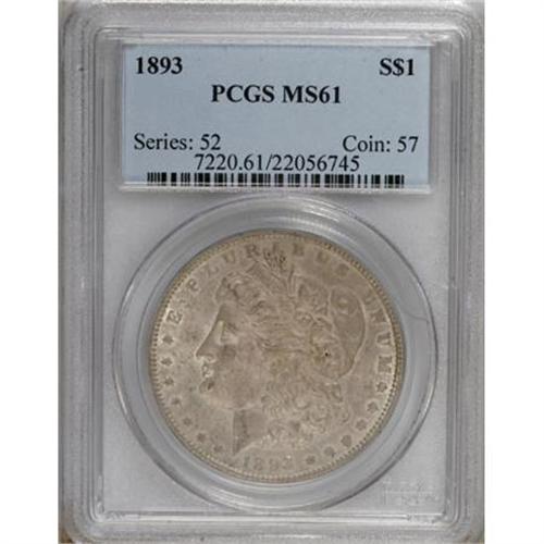 <B>1893 $1 MS61 PCGS.</B></I> PCGS Population (165/2817). NGC Census: (124/1508). Mintage: 389,792. Numismedia Wsl. Price for NGC/PCGS coin in MS61: $650. (#7220)<BR><BR><B>Coin Engraver:</B> George T. Morgan<BR><BR><b>Shipping:</b> Coins & Currency (<a target="_blank" href="http://www.heritageauctions.com/common/shipping.php">view shipping information</a>)