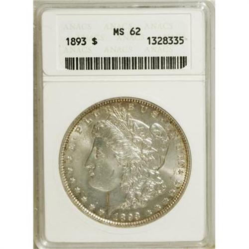 <B>1893 $1 MS62 ANACS.</B></I> Virtually untoned with bright, satiny luster that exceeds expectations for the issue. Crisply detailed with just a hint of rose patina at the margins. Light, wispy flaws on each side preclude a finer designation.<BR><BR><B>Coin Engraver:</B> George T. Morgan<BR><BR><b>Shipping:</b> Coins & Currency (<a target="_blank" href="http://www.heritageauctions.com/common/shipping.php">view shipping information</a>)