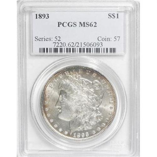 <B>1893 $1 MS62 PCGS.</B></I> Powder-blue and peach patina embraces the borders of this shimmering and nicely struck example. Cleaner than customary for an MS62. The 1893 ranks among the lowest mintage Philadelphia issues.<BR><BR><b>Shipping:</b> Coins & Currency (<a target="_blank" href="http://www.heritageauctions.com/common/shipping.php">view shipping information</a>)