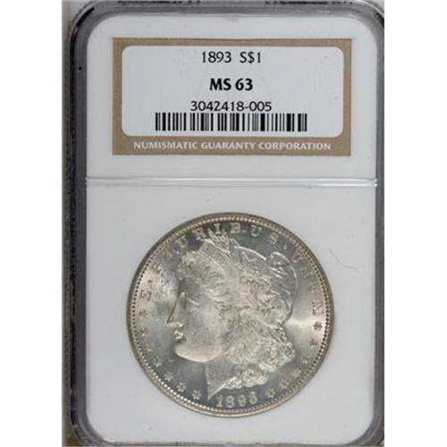 <B>1893 $1 MS63 NGC.</B></I> Among the lowest-mintage P-mint business strike Morgans, the 1893 issue saw only 389,000 pieces produced. This example offers considerable frosty luster over the untoned surfaces, and appears a bit conservatively graded, as Liberty's cheek and the surfaces elsewhere are relatively free of distractions.<BR><BR><B>Coin Engraver:</B> George T. Morgan<BR><BR><b>Shipping:</b> Coins & Currency (<a target="_blank" href="http://www.heritageauctions.com/common/shipping.php">view shipping information</a>)