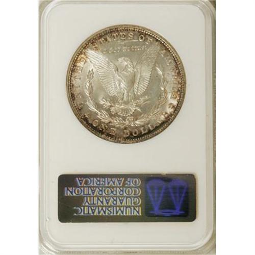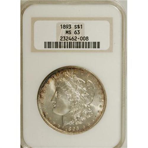 <B>1893 $1 MS63 NGC.</B></I> Boldly struck and thoroughly lustrous with attractive russet and electric-blue peripheral toning. Conservatively assessed despite a pair of faint slide marks on the chin. Certified in a former generation holder.<BR><BR><B>Coin Engraver:</B> George T. Morgan<BR><BR><b>Shipping:</b> Coins & Currency (<a target="_blank" href="http://www.heritageauctions.com/common/shipping.php">view shipping information</a>)