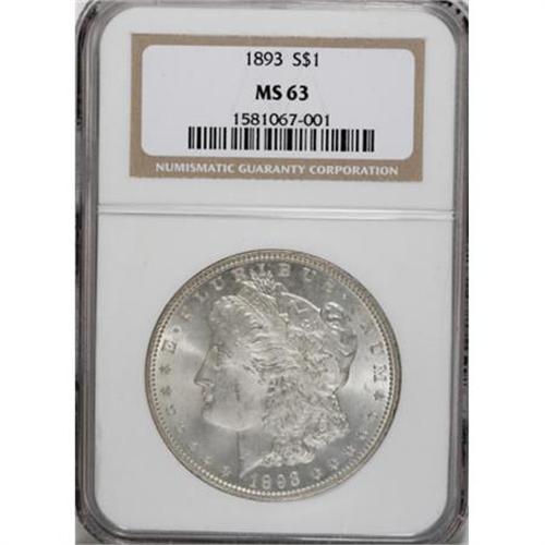 <B>1893 $1 MS63 NGC.</B></I> Nice luster emanates from satiny surfaces that possess a silver-gray cast. Generally well defined, with just a few minor obverse luster grazes.<BR><BR><B>Coin Engraver:</B> George T. Morgan<BR><BR><b>Shipping:</b> Coins & Currency (<a target="_blank" href="http://www.heritageauctions.com/common/shipping.php">view shipping information</a>)