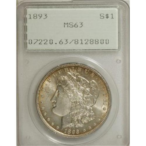 <B>1893 $1 MS63 PCGS.</B></I> Well struck throughout, without any softness above Liberty's ear or on the eagle's breast feathers. Pleasing satin luster across both sides accents the orange peripheral toning on the obverse. A few trivial marks are noted on Liberty's cheek and in the obverse fields. Encapsulated for many years in a first-generation PCGS holder. <BR><BR><B>Coin Engraver:</B> George T. Morgan<BR><BR><b>Shipping:</b> Coins & Currency (<a target="_blank" href="http://www.heritageauctions.com/common/shipping.php">view shipping information</a>\)