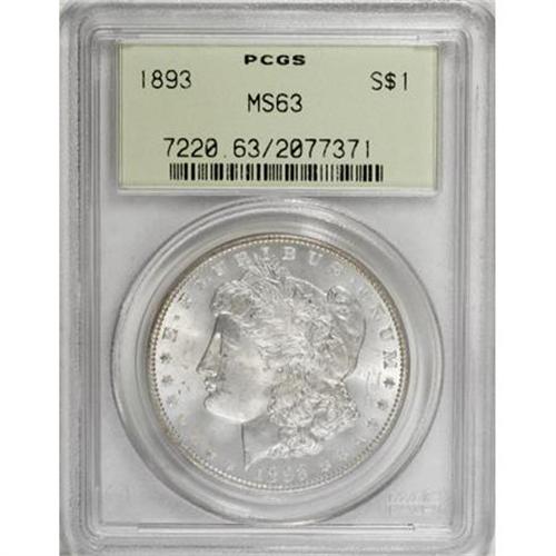 <B>1893 $1 MS63 PCGS.</B></I> Light green-gold toning adorns this moderately abraded and lustrous low mintage dollar. The strike shows minor incompleteness on the hair above the ear. In an old green label holder.<BR><BR><B>Coin Engraver:</B> George T. Morgan<BR><BR><b>Shipping:</b> Coins & Currency (<a target="_blank" href="http://www.heritageauctions.com/common/shipping.php">view shipping information</a>)