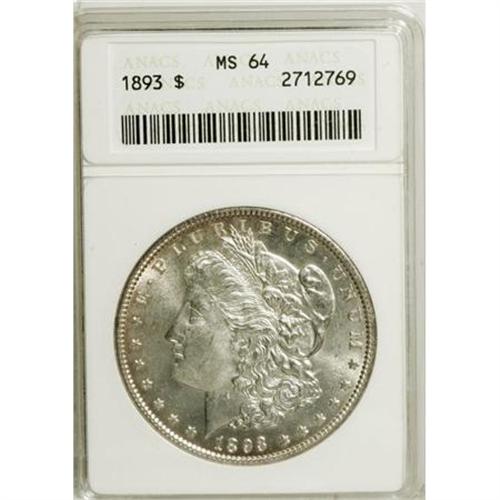 <B>1893 $1 MS64 ANACS.</B></I> Hints of rose patina grace the rims, but the lustrous fields and devices are untoned. The hair above the ear is soft, but the strike is generally sharp. A strike-through is noted near the base of the cap. Liberty's profile is lightly die doubled, and the peak of the 3 is recut.<BR><BR><b>Shipping:</b> Coins & Currency (<a target="_blank" href="http://www.heritageauctions.com/common/shipping.php">view shipping information</a>)
