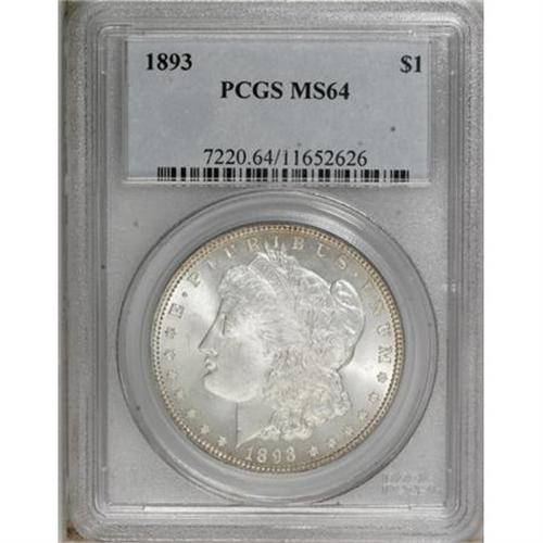 <B>1893 $1 MS64 PCGS.</B></I> This nicely struck Choice Morgan dollar has a hint of golden toning near the obverse rim. The fields and eagle are remarkably unabraded, and the portrait has only a few faint grazes. The peak of the 3 is repunched, as usual for this low mintage date.<BR><BR><b>Shipping:</b> Coins & Currency (<a target="_blank" href="http://www.heritageauctions.com/common/shipping.php">view shipping information</a>)
