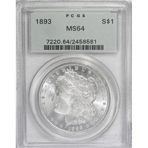 <B>1893 $1 MS64 PCGS.</B></I> This low mintage Morgan dollar provides vivacious luster and a bold strike. The centers have a hint of golden toning. Well preserved despite minor grazes on the left obverse. In a green label holder.<BR><BR><b>Shipping:</b> Coins & Currency (<a target="_blank" href="http://www.heritageauctions.com/common/shipping.php">view shipping information</a>)