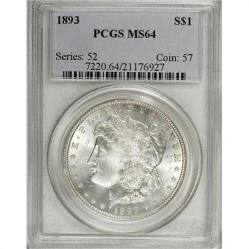 <B>1893 $1 MS64 PCGS.</B></I> VAM-3. The Closed 3 in the date is doubled along the upper edge. Well struck with intense mint luster over flashy, essentially untoned surfaces. The reverse only has a few slight field blemishes, while the obverse shows a small disturbance along the rim near 6 o'clock, and a shallow graze near Liberty's mouth. <BR><I>From The Arnold & Harriet Collection, Part Two.</B></I><BR><BR><B>Coin Engraver:</B> George T. Morgan<BR><BR><b>Shipping:</b> Coins & Currency (<a target="_blank" href="http://www.heritageauctions.com/common/shipping.php">view shipping information</a>)