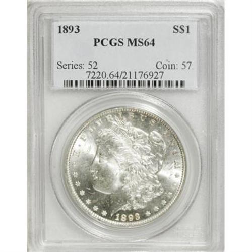<B>1893 $1 MS64 PCGS.</B></I> VAM-3. The Closed 3 in the date is doubled along the upper edge. Well struck with intense mint luster over flashy, essentially untoned surfaces. The reverse only has a few slight field blemishes, while the obverse shows a small disturbance along the rim near 6 o'clock, and a shallow graze near Liberty's mouth. <BR><BR><B>Coin Engraver:</B> George T. Morgan<BR><BR><b>Shipping:</b> Coins & Currency (<a target="_blank" href="http://www.heritageauctions.com/common/shipping.php">view shipping information</a>)