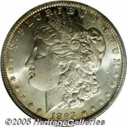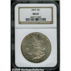 <B>1893<img border='0' src='http://www.heritagecoins.com/images/star.gif' width=10 height=10>$1 MS65 NGC.</B></I> A splendid Gem for the connoisseur. This lovely dollar has pale golden-brown color with brighter gold toning along the border. The surfaces, both devices and fields, have highly lustrous mint frost. This is among the finest examples of this issue available today, and is exceeded by only a handful of better coins. Population: 52 in 65, 3 finer (2/05).