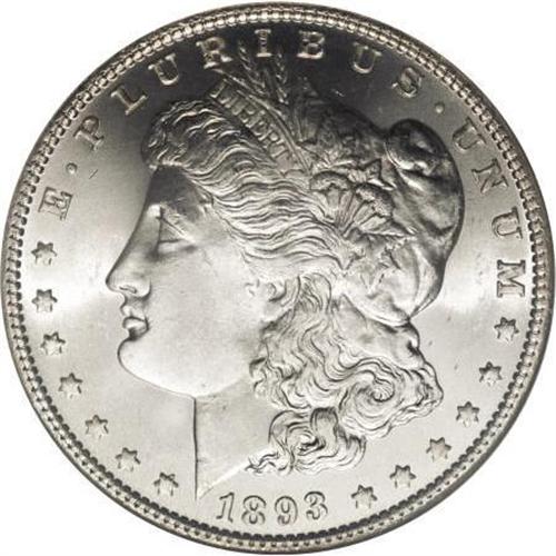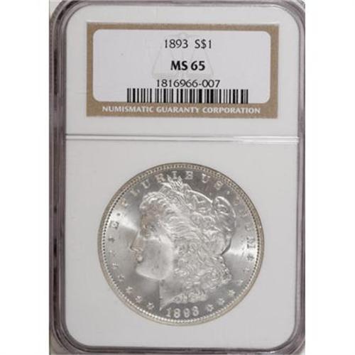 <B>1893 $1 MS65 NGC.</B></I> A fresh example with loads of frost dripping from both sides, and boldly struck. Untoned and brilliant, with cartwheel luster and no offensive marks to mention. The peak of the 3 in the date is repunched, as often seen on this low mintage date. Census: 64 in 65, 3 finer (11/07).<BR><I>From The Motor City Collection.</B></I><BR><BR><B>Coin Engraver:</B> George T. Morgan<BR><BR><b>Shipping:</b> Coins & Currency (<a target="_blank" href="http://www.heritageauctions.com/common/shipping.php">view shipping information</a>)