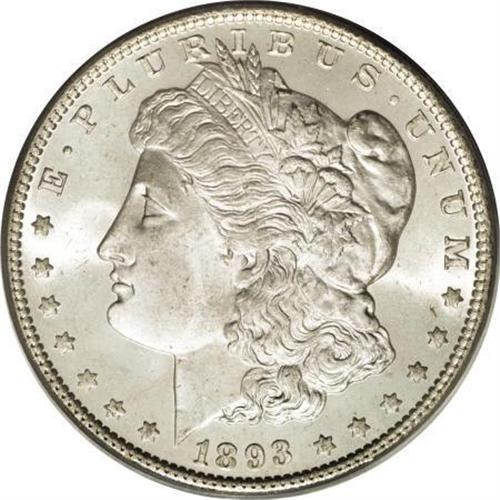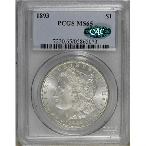 <B>1893 $1 MS65 PCGS. CAC.</B></I> Faint chestnut toning denies absolute brilliance, but this lustrous and well preserved Gem otherwise looks as if it were just lifted from a bin of freshly struck Morgan dollars. Boldly impressed aside from minor incompleteness on the hair above the ear. As usual for the date, the peak of the 3 is recut.<BR><BR><B>Coin Engraver:</B> George T. Morgan<BR><BR><b>Shipping:</b> Coins & Currency (<a target="_blank" href="http://www.heritageauctions.com/common/shipping.php">view shipping information</a>)