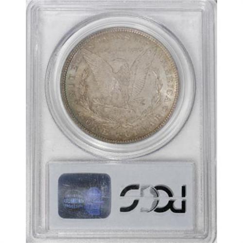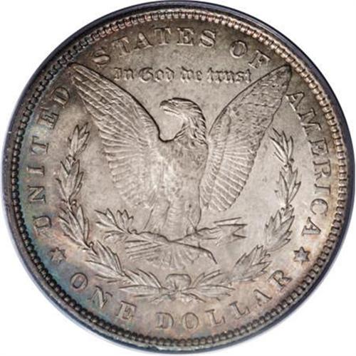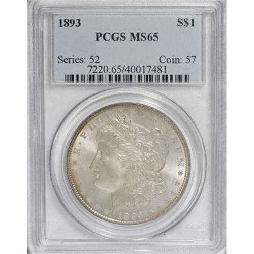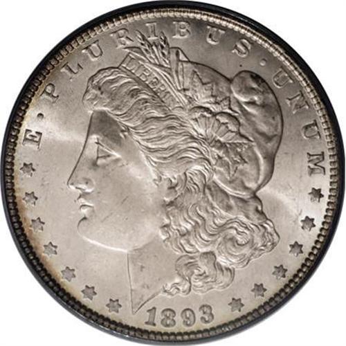 <B>1893 $1 MS65 PCGS.</B></I> Bowers (1993) advises cherrypicking for quality when it comes to the 1893. The present Gem is certainly among the more appealing survivors of this issue, with sharp striking detail throughout and a pleasing satin finish. The obverse is champagne tinged with some more extensive color along the left border. The reverse, on the other hand, is richly toned with blushes of cobalt-blue, lavender, and apricot patina over a base of medium gray color. The reverse is lightly die doubled, most noticeably along the bottom of the wreath. PCGS has only graded four examples of this issue finer than MS65 (6/07). <BR><BR><B>Coin Engraver:</B> George T. Morgan<BR><BR><b>Shipping:</b> Coins & Currency (<a target="_blank" href="http://www.heritageauctions.com/common/shipping.php">view shipping information</a>\)