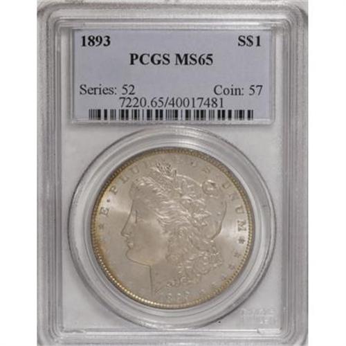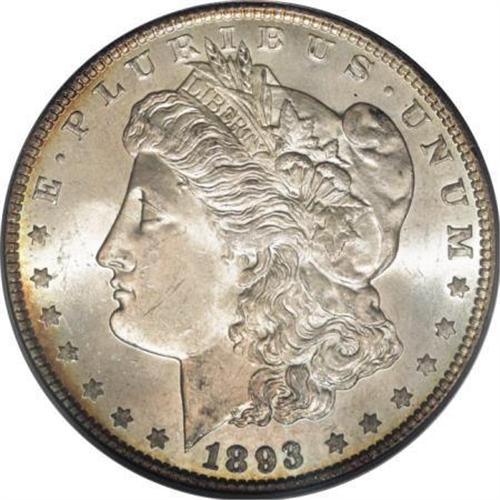<B>1893 $1 MS65 PCGS.</B></I> Bowers (1993) advises cherrypicking for quality when it comes to the 1893. The present Gem is certainly among the more appealing survivors of this issue, with sharp striking detail throughout and a pleasing satin finish. The obverse is champagne tinged with some more extensive color along the left border. The reverse, on the other hand, is richly toned with blushes of cobalt-blue, lavender, and apricot patina over a base of medium gray color. The reverse is lightly die doubled, most noticeably along the bottom of the wreath. PCGS has only graded four examples of this issue finer than MS65 (1/08). <BR><BR><B>Coin Engraver:</B> George T. Morgan<BR><BR><b>Shipping:</b> Coins & Currency (<a target="_blank" href="http://www.heritageauctions.com/common/shipping.php">view shipping information</a>)